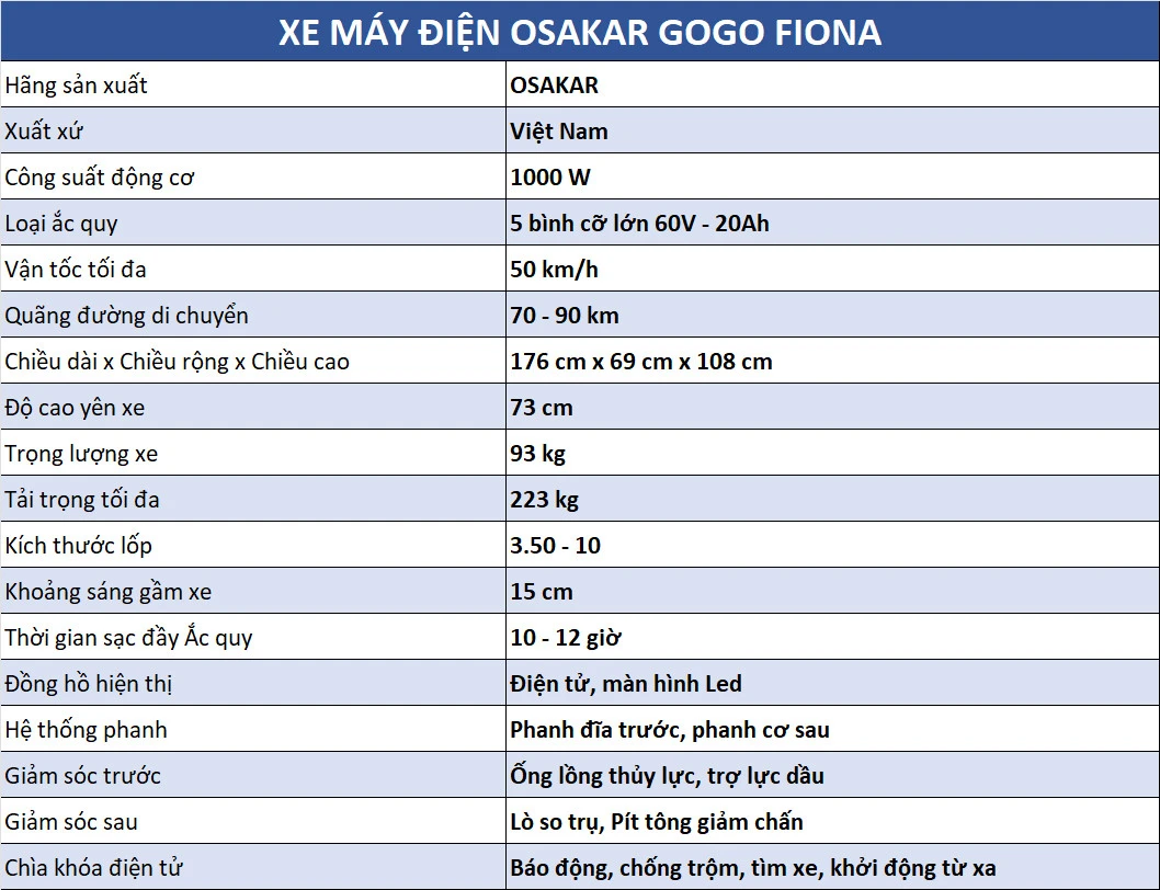 THÔNG SỐ KỸ THUẬT XE MÁY ĐIỆN OSAKAR GOGO FIONA