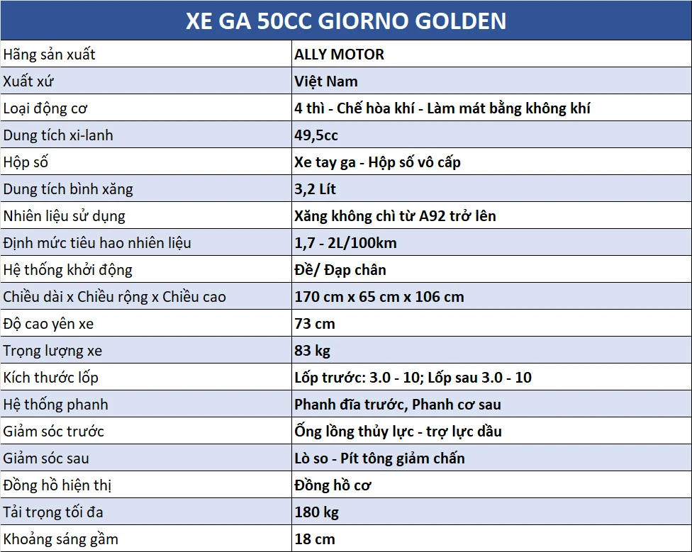 THÔNG SỐ KỸ THUẬT GIORNO 50CC GOLDEN: